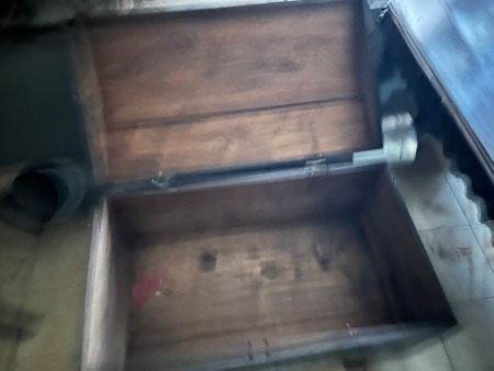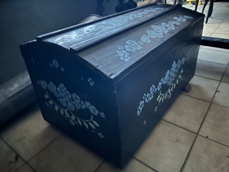ANTIEKE ZWARTE HOUTEN KOFFER MET BESCHILDERD BLOEMENMOTIEF
