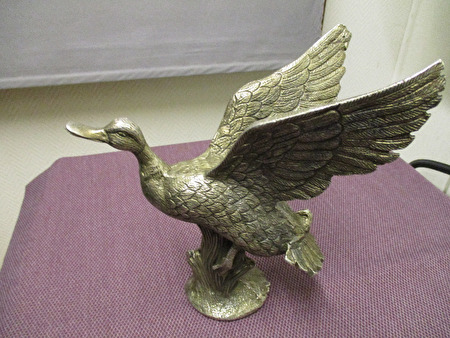 Massief beeld van opvliegende eend,in zilverkleurige messing.Mooi afgewerkt met veel oog voor details en waardevol.Past vrijwel in elk interieur.Zware massieve uitvoering met ouderdom patine.Afmetingen : Breedte x Hoogte x Diepte =+/- 23 cm x 25 cm x 13 cm. Gewicht = +/-2 kg 58 gram.Afhalen is mogelijk,na afspraak.Verzendingskosten ten laste van de koper,in overleg af te spreken.U mag steeds een redelijk bod doen.Mijn verzamelingen en inboedel,worden stelselmatig te koop aangeboden,omdat ik verhuisd ben en veel kleiner ben gaan wonen.