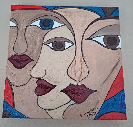Wanneer drie gezichten in een verwerkt worden ontwaar je nog beter de aparte wijze waarop sommige personen naar de wereld kijken. De ene noemt het wat streng, de andere vindt het dan weer somber, ieder bekijkt het op zijn eigen manier. grootte 30x30cmprijs : 30 €