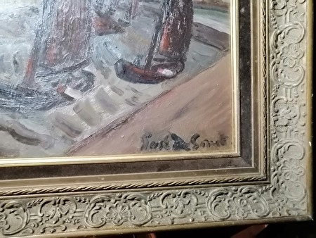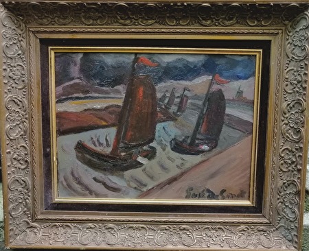 Gustave Franciscus De Smet '' Botters op de Rivier " olieverf op doek 30 x 40 cm in lijst 44 x 54 cmSmet, Gustave de werd in België geboren. Aan het begin van de Eerst Wereldoorlog, 1 augustus 1914, Gustave de Smet en zijn familie, vergezeld met zijn vriend Frits van den Berghe, vertrokken zij naar Amsterdam. Hij liet een groot aantal schilderwerken bij zijn broer in Gent achter. In die tijd schilderde hij in luministische stijl in een post-impressionistische vorm. De invloed van de Amsterdamse kunstenaars was enorm. De Haagse school periode was aan zijn einde en de nieuwe moderne invloed van de Franse fauvisten vond langzaam zijn weg naar Amsterdam, met als voorbeeld de schilders Leo Gestel, Jan Sluijters en Le Fauconnier. Gestel in het bijzonder introduceerde De Smet in de kunstenaarskringen van Amsterdam. In 1914 Le Fauconnier vestigde zich in Nederland en werkte in Bergen waar hij samen met Van Gestel de Bergense School stichtte. De Smet werd sterk beinvloed door de bruine en donkere kleuren van de Bergense School.
