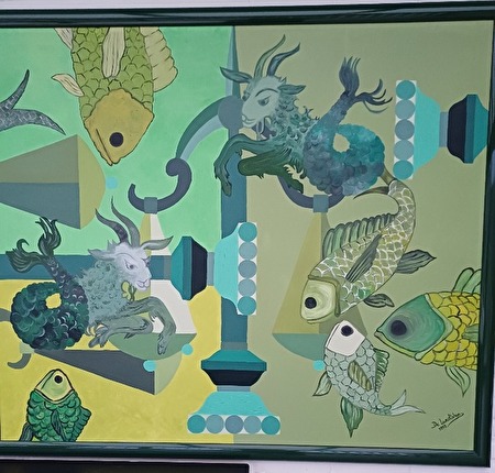 Weegschaal, vissen en steenbok werden hier bewust in een compositie samengebracht en gekleurd met alle tinten groen om de hoop uit te beelden va een streven ar een echter onbereikbare harmonie. Grootte 130x155cm met kaderprijs : 495 €