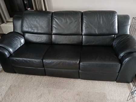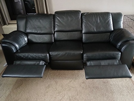 Een kwaliteitsvolle, zwarte, mooie lederen 3-zit, lengte 2,30m met hoge rugleuning, verstelbare hoofdsteunen en relax aan beide uiteinde.