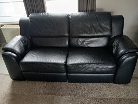 Een kwaliteitsvolle, zwarte, mooie lederen 2- zit, lengte 2m met hoge rugleuning, verstelbare hoofdsteunen en relax aan beide uiteinde.