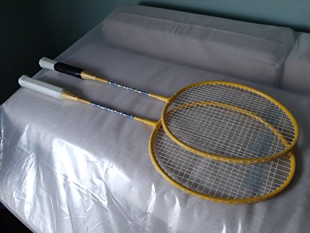 2 gele badminton rackets uit de Decathlon.