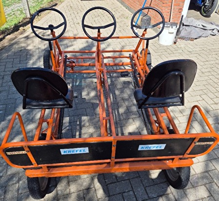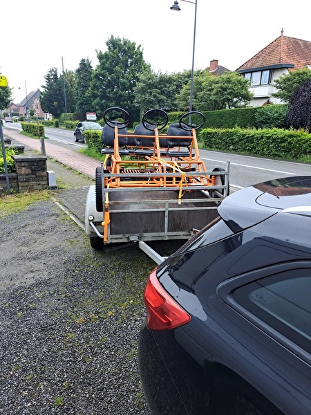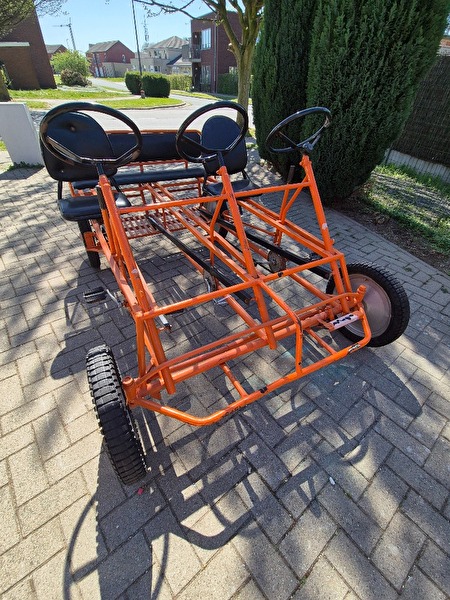 Gokart voor 2 personen die kunnen trappen ideaal voor losse carnavalgroep of jeugdbeweging.
