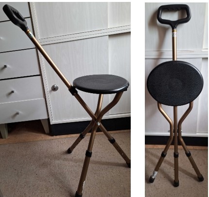 Een handigheid voor iemand die moeilijk te been is. Een lichtgewicht wandelstok die zeer eenvoudig kan omgevormd worden tot een handig zitstoeltje. Nieuw aangekocht voor 120 euro. Nooit gebruikt.