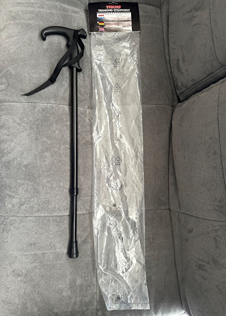 Wandelstok verstelbaar in hoogte, nieuw, nooit gebruikt, met rubberen dop. Drie stuks, 10€ stuk. Nog in verpakking.