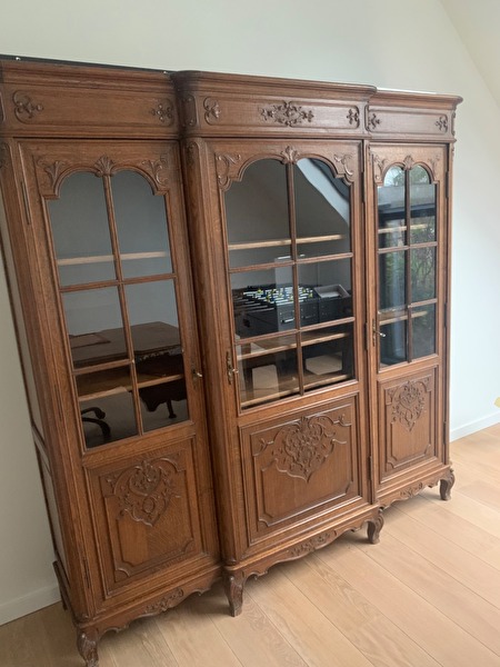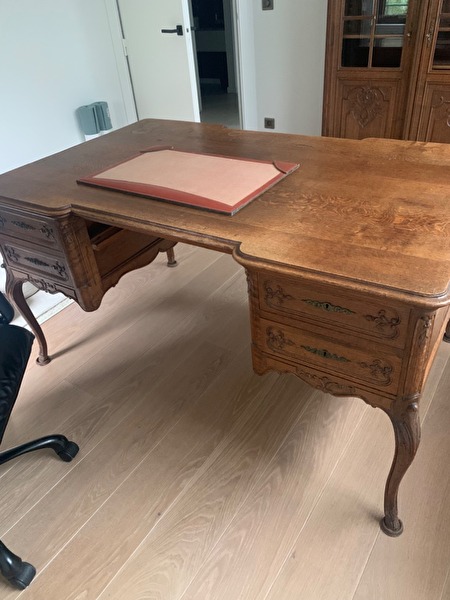 Eiken antieke bureau met boekenkast( deurs)met 4 stoelen