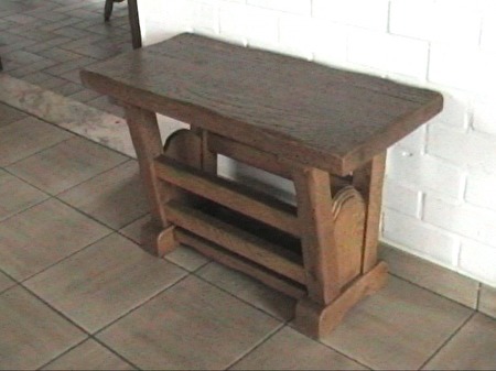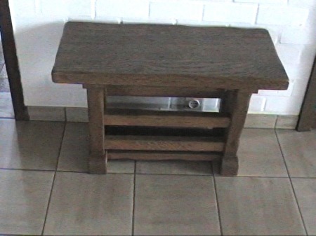Dagblad houder voorzien van tafelblad in eik Met tafelblad afm. L.= 75 cm ,Br. =34 cm ,Dikte = 4 cm Breedte van de poot 26 cm ,H. van de houder = 46 cm ,kan ook dienen om een bloempot op te plaatsen of iets anders weegt 14 kgKomen halen of verzenden met ;