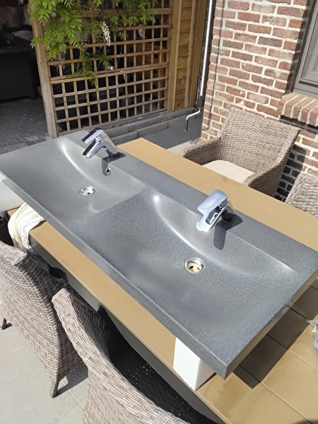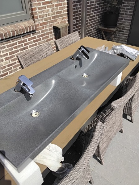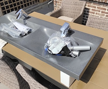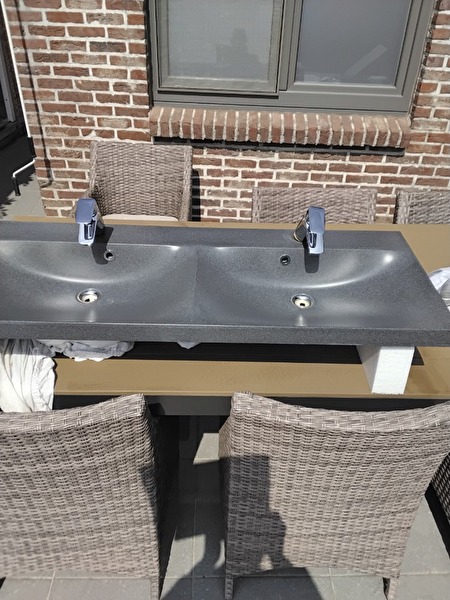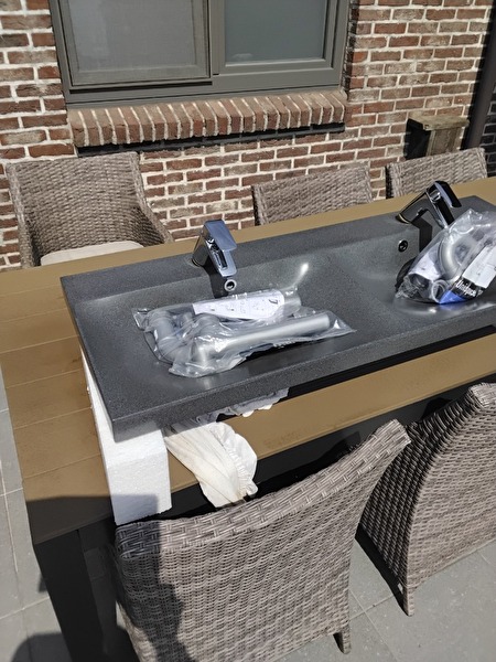 Wastafel voor badkamer met 2 hansgrohe kranen en nieuwe afvoer