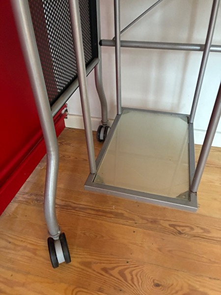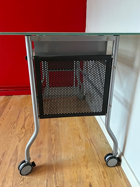 Bureau in melkglas, op wieltjes (wat het handig maakt)