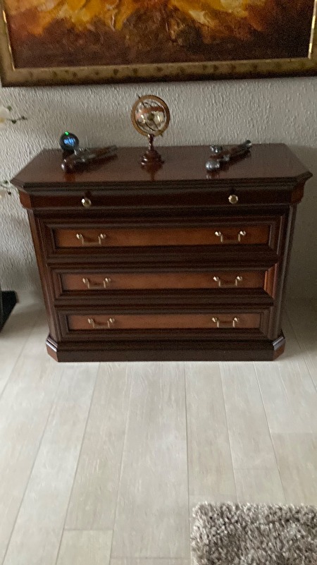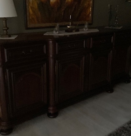 Eetkamer in notelaar hout bestaande uit dressoir, tafel met 6 stoelen, vitrinekast en commode met schuiven