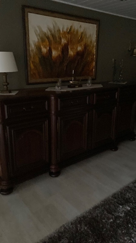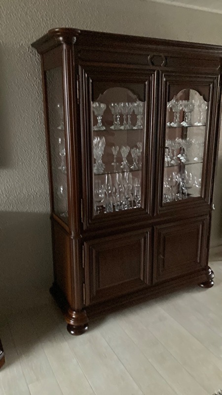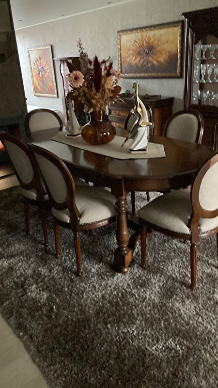 Eetkamer in notenhout bestaande uit dressoir, vitrinekast , commode en tafel met 6 stoelen