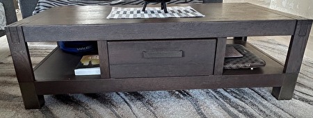 - salontafel: rechthoekig met 2 open vakken en 1 lade 130x65x40