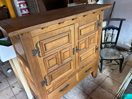 Massief eikenhouten eetplaats, bestaande uit dressoir, barkast, rechthoekige tafel en zes stoelen met biezen zittingen in goede staat.De dressoir is volledig demonteerbaar voor verplaatsing.