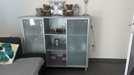 Eetkamer lange comode hoge barkast tafel met glas en zes stoelen Heb ook moderne hoeksalon grijs en slaapkamer bed en comode en kleekas witte te koop ,