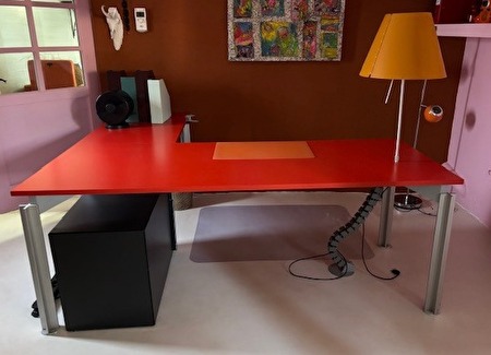 TE KOOP - BULO rode bureau. Kan uit elkaar gehaald worden.Het verticale deel kan als eettafel gebruikt worden en apart gekocht worden. Prijs is dan te onderhandelen.
