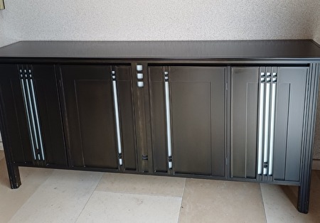 Zwarte gelakte houten dressoir L 212 B 49 H 95 met bijhorendrond hoektafeltje met 2 melkglazen schabbetjes, Dia 45 H 63.
