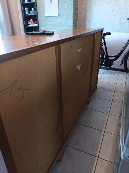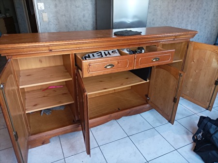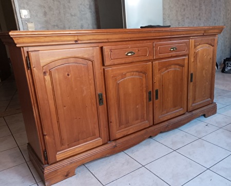 Te koop aangeboden: een robuust en elegant houten sideboard in uitstekende staat. Dit meubelstuk heeft een warme, gepolijste afwerking en is voorzien van vier deuren en één lade, allemaal met stevige metalen handgrepen. Dankzij het tijdloze ontwerp past het perfect in zowel klassieke als moderne interieurs.prijs : 150 €