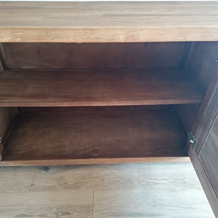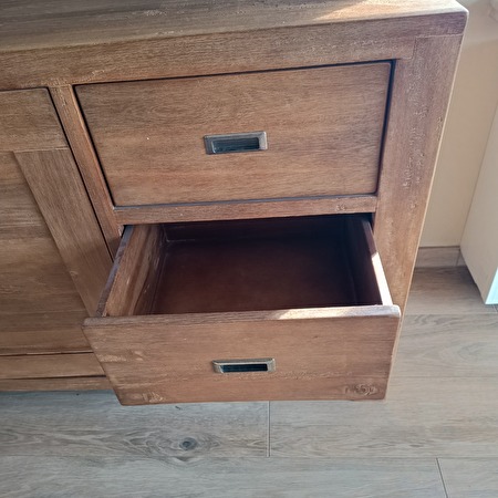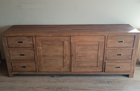 HERZELE • Prachtig dressoir in massief hout met een warme, natuurlijke afwerking. Deze royale kast straalt klasse en rust uit en biedt volop opbergruimte voor servies, tafellinnen of andere spullen. meer...
