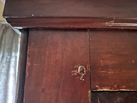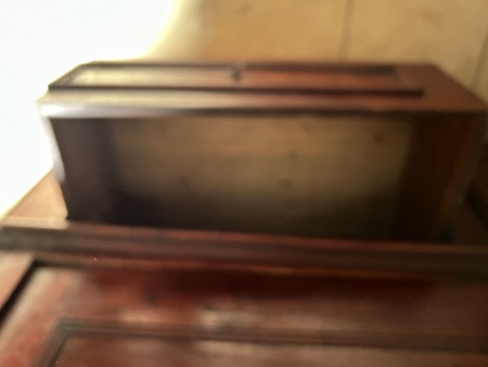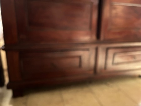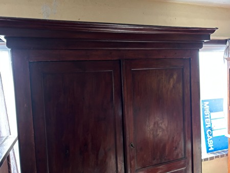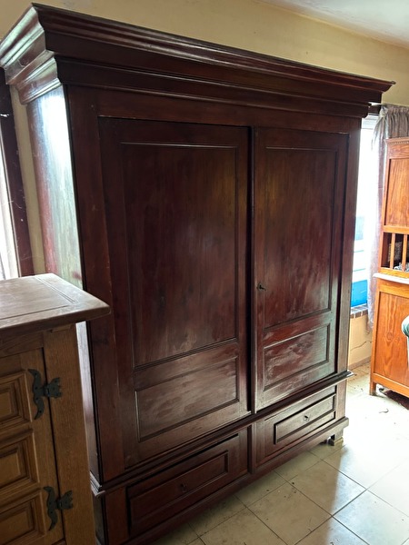 Antieke linnen- of servieskast 200 jaar oud in acajou hout, afkomstig van boerderij, in neoclassicistische burgerlijke stijl.Verstekken gepint met houten tappen.