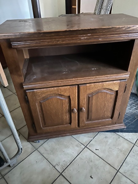 Eiken kastje met twee deuren met daarboven een uitschuifbaar bovenvlak ideaal voor stereomeubel, het top blad kan draaien ideaal om uw TV scherm op te plaatsen en naar uw richting te draaien.Afmetingen : lengte 90 cm, breedte 45,5 cm, hoogte 83 cm