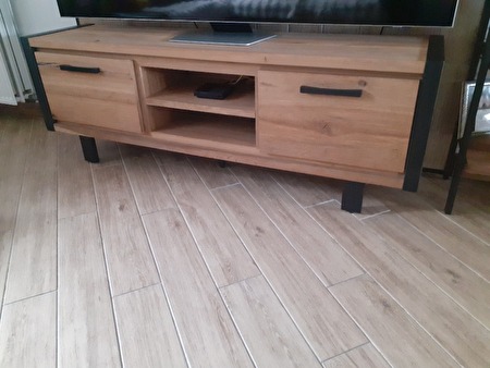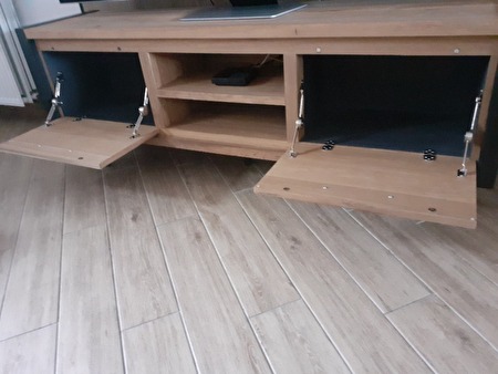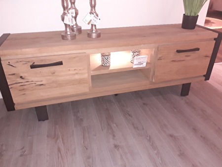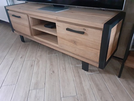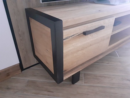 de tv kast is afgewerkt met zwart metaal.zwarte nerven in het houtde kast is in perfecte nieuwstaat.niks van schade of gebruikssporen aan.