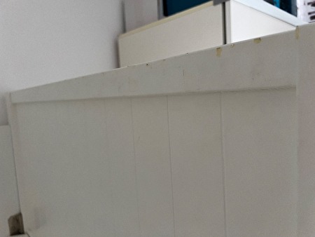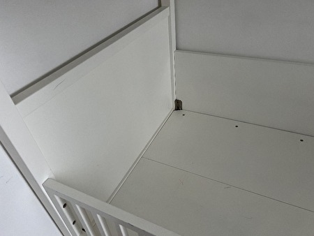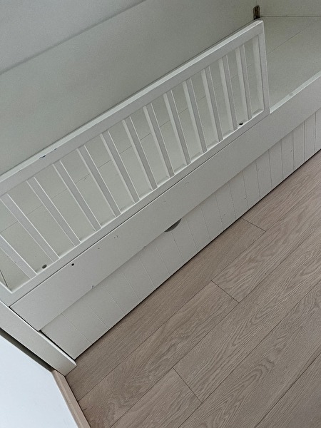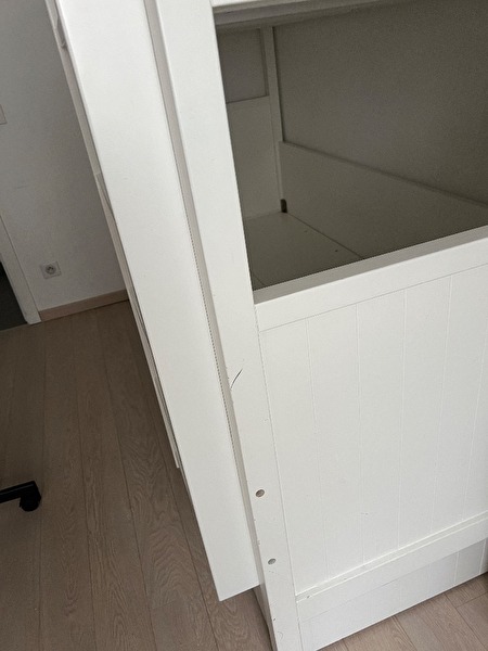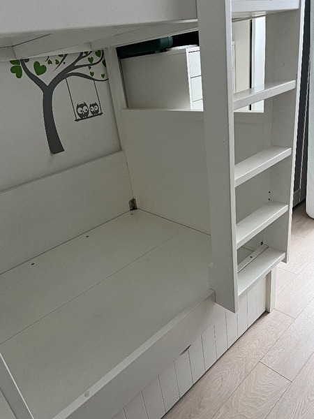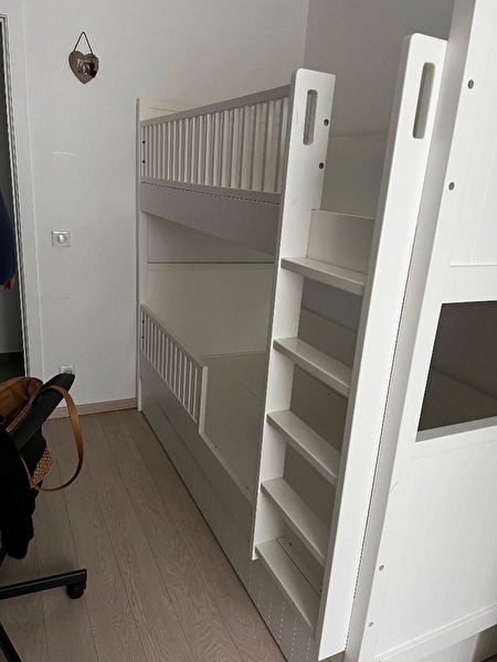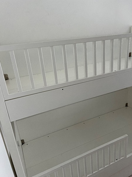 Een massief wit gelakt stapelbed,heel stevig wel met gebruikssporen en zonder matrassen.