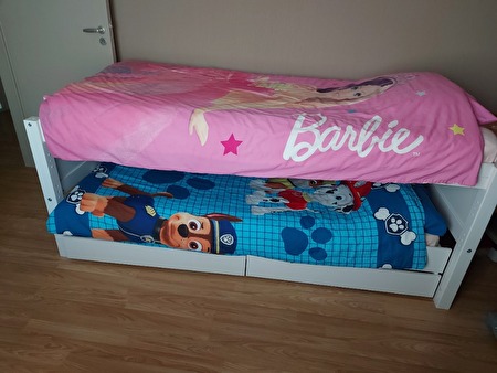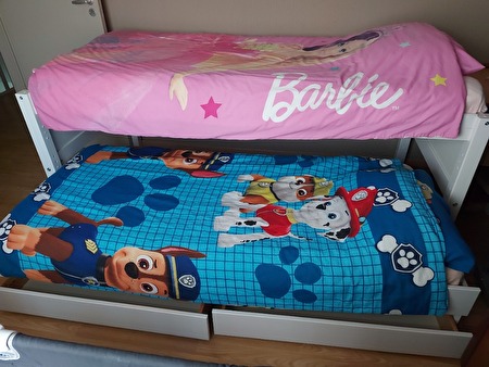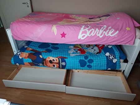 Hoogslaper met twee schuiven.Het onderste bed kan je er vanonder rollen. De twee schuiven zijn eveneens rolbaar