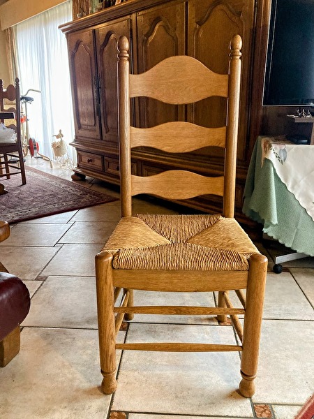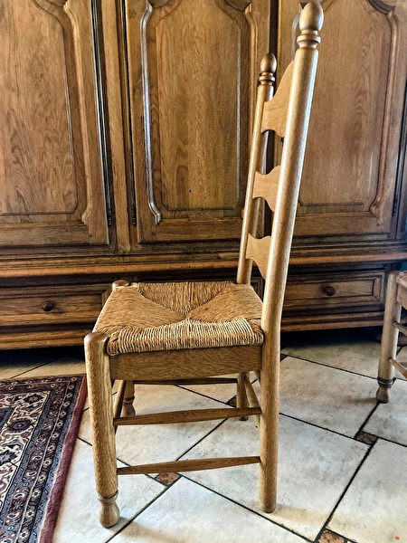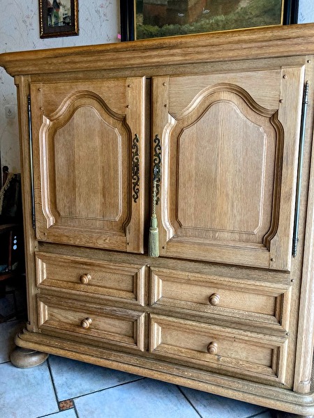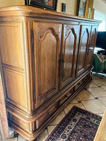 Mooie, tijdloze eetkamer in massief eikenhout. Bestaat uit een stevige tafel met stoelen en een ruime servieskast met veel opbergruimte, alsook een barkastZeer degelijk, in mooie staat en perfect onderhouden.