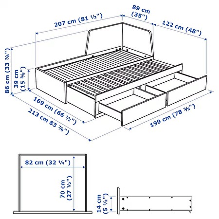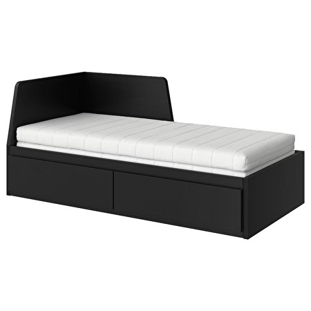 "Flekke" uitschuifbaar bed, inclusief 2 lades en 2 matrassen (overtrekken afritsbaar en droogkuis gereinigd.)"Kallax" kast met 16 vakken, inclusief 4 manden (zeegras) en 8 inzet kasten met deurtjes.