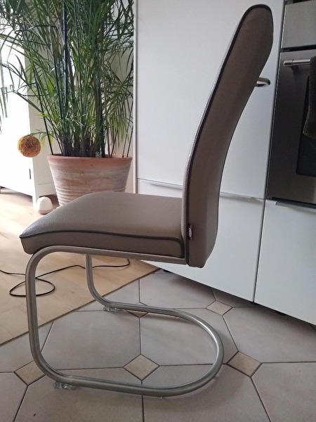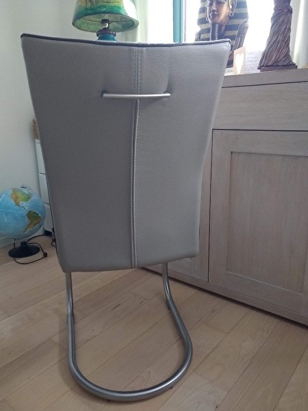 4 stevige stoelen in kunstleder met zeer goed zitcomfort en in goede staat. Het handvat is super handig om je stoel te verschuiven. Kleur: beige-taupe, zithoogte: 47 cm, breedte: 42 cm.De nieuwprijs was 245,00 per stoel.