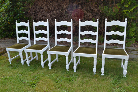 5 stevige /degelijke stoelen in hout (eik!).Zitvlakken zijn in groene velours.