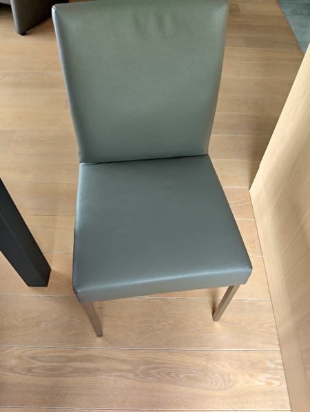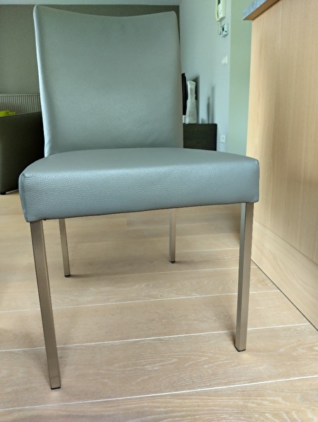 Te koop 6 stoelen merk Bert Plantagie type Pose, leder kleur LD1400 Lava, poten in geborsteld RVS, nauwelijks gebruikt in quasi nieuwstaat.Afmetingen: zithoogte 47cm, breedte 48cm, totale hoogte 90cm