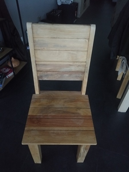 6 stoelen in teak met zitkussens. In goede staat. Moet dringend weg.