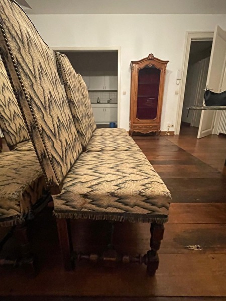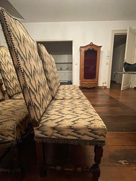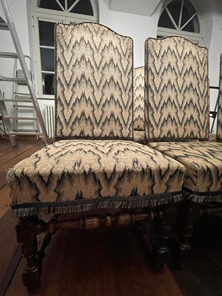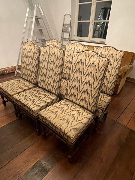 Deze set van zes antieke eetkamerstoelen heeft een klassieke, elegante uitstraling. De stoelen zijn bekleed met een vintage stof in een goud-beige tint met donker patroon, afgewerkt met decoratieve biezen en franjes aan de onderrand van de zitting.prijs : 250 €