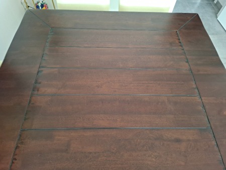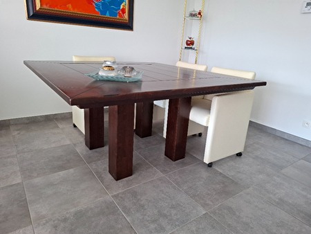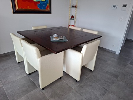 Eetkamertafel in perfecte staat,150x150 cm (zie foto's). VRAAGPRIJS € 400,- plus GRATIS 8 kuipstoelen op wieltjes, kleur ecru.
