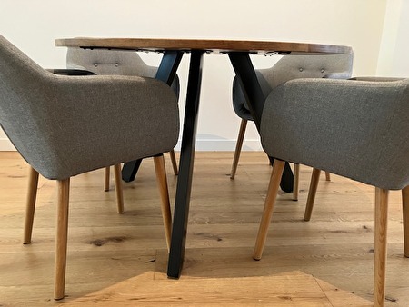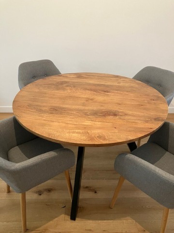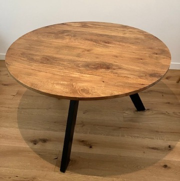 Ronde tafel van 1.2 diameter en 76cm hoog, heeft een donker houten blad met hieronder zwarte metalen poten. Zo goed als nieuw, enkel blad heeft enkele kleine krasjes door gebruik. Ik doe ze weg wegens verhuis.prijs : 190 €