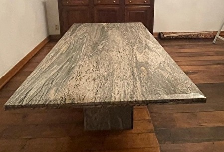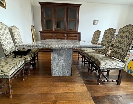 Elegante eettafel heeft een massief marmeren blad met unieke natuursteenpatronen in grijs- en beige tinten. Het grote, rechthoekige blad rust op een bijpassende centrale marmeren sokkel.