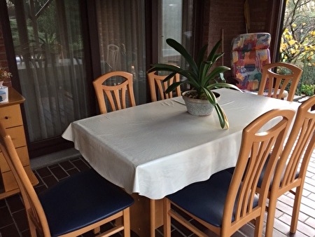Tafel met 6 stoelen te koop. Blauwe skai bekleding op de stoelen.