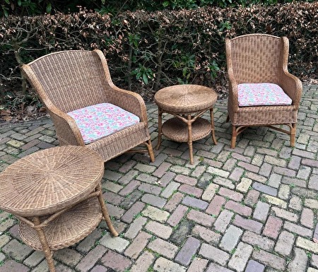 twee grote rieten zetels met bijhorende kussens en twee rieten bijzettafeltjes ( H 55 cm / diameter 54 cm). In zeer goede staat