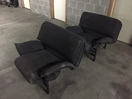 2 originele relaxzetels Veranda de Vico Magistretti van Cassina. Beide overtrekken "versleten", maar die kunnen vervangen worden.Meer info over Cassina op deze site: