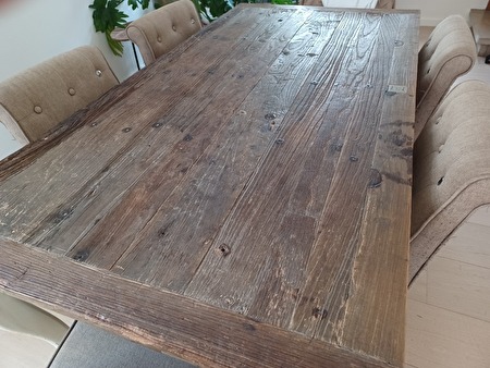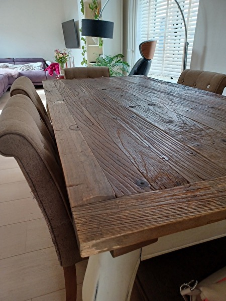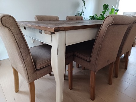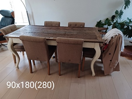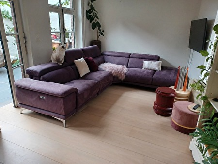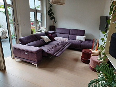 Moderne hoekzetel met 2x elektrische relax. 5 jaar jong.heel goeie staat uitgezonderd één klein gaatje. 315 x 250 (4 stukken). Houten tafel met 2 verlengstukken 80x180(280) stoelen gratis gezien de toestand. (Zetel €425 - en/of Tafel €150)prijs : 425 €