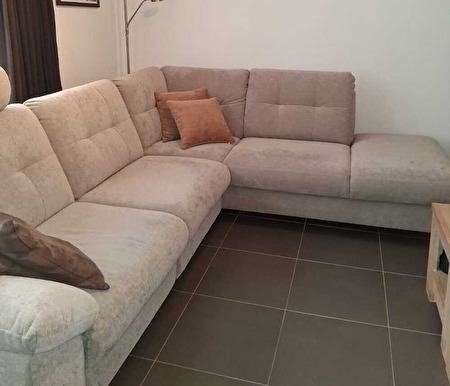 De zetel is van gemakkelijk te onderhouden stof. Links zit de long chaise, rechts de relax met elektrische bediening. In het midden zitten de standaard zittingen. Lengte: 2m65. Aangekocht in mei maart 2025. Zo goed als nieuw.prijs : 650 €