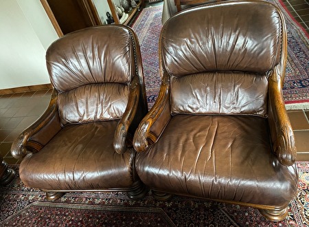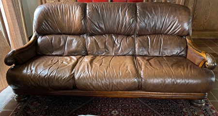 Bruine salon in kwaliteitsleder en houten armleuningen. In perfecte staat.