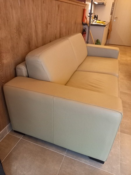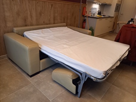 Beige slaapbank, lederen uitzicht. zelf afhalen.