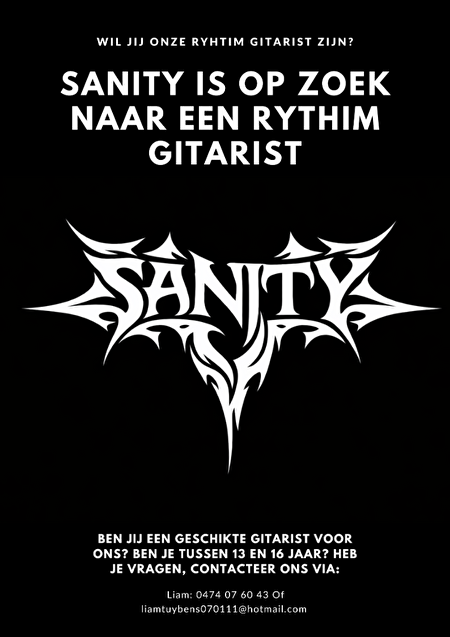 Ik ben Liam Tuybens. Mijn band is opzoek naar een gitarist van tussen de 13-16 jaar die van Metal en de andere subgenres houd. We zoeken iemand met rauwe energie en iemand die commitment heeft. We coveren songs om met elkaar te leren spelen. We spelen songs van Metallica, Slipknot, Green Day, Black Sabbath... Als jij dit bent stuur mij dan een mail of berichtje. liamtuybens070111@hotmail.com of 0474076043