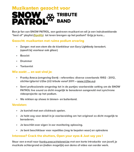 Ben je fan van SNOW PATROL, een gedreven muzikant en wil je een indrukwekkende “best of” playlist (Spotify) tot leven brengen op het podium? Grijp je kans… Gezocht: Zanger met ruime podium ervaring met een stem die de klankkleur van Gary Lightbody benadert. (speelt bij voorkeur ook gitaar)