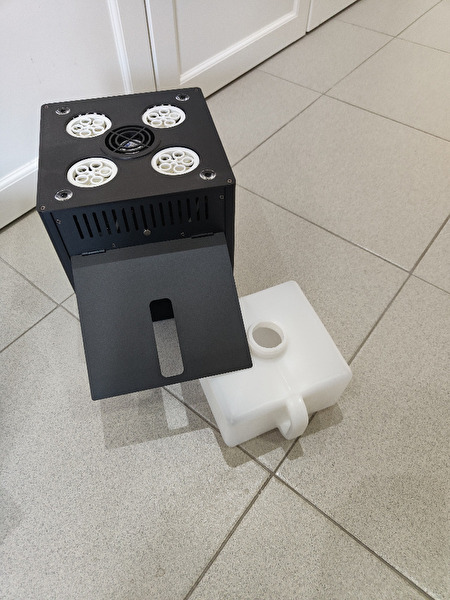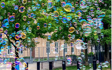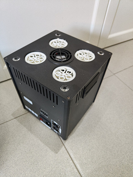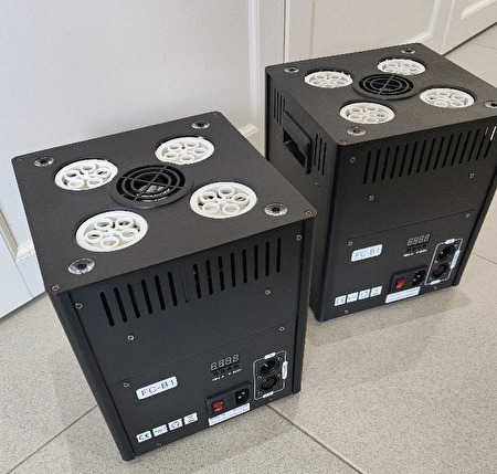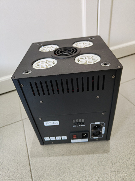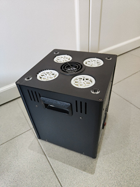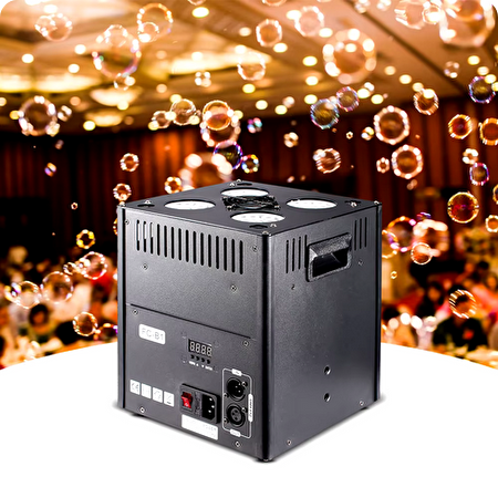 Verticale bellenblaasmachine met vier roterende outputs en gekleurde ledverlichting van de bellen.