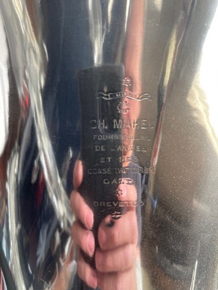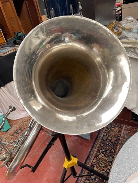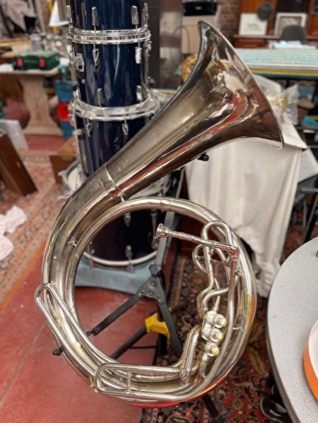 Antieke helicon bastuba in Sib (B♭), vermoedelijk gebouwd ca. 1895–1915, geleverd door CH. Metel (Gent, België), leverancier van conservatoria en muziekkorpsen. Instrument vervaardigd uit messing, met originele ventielen, intacte buizenstructuur en leesbare originele gravure. Het instrument verkeert in goede speelbare staat, werd recent onderhouden, getest op lekdichtheid en intonatie met mondstuk. Historisch waardevol en muzikaal functioneel koperinstrument.Vraagprijs : 1750 €